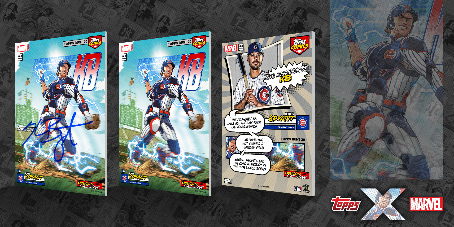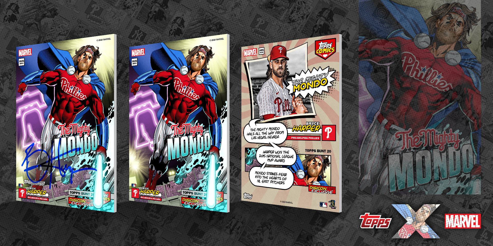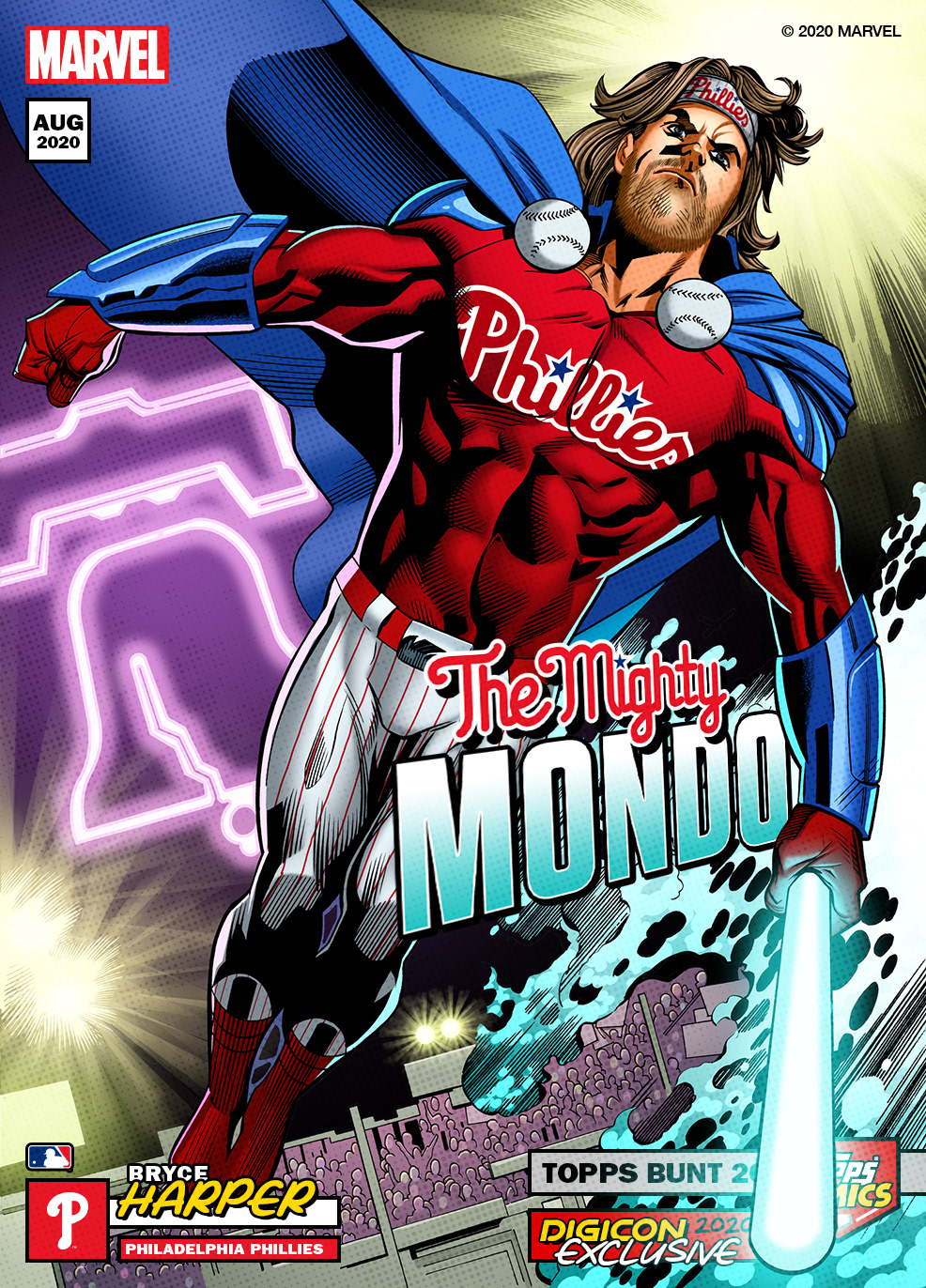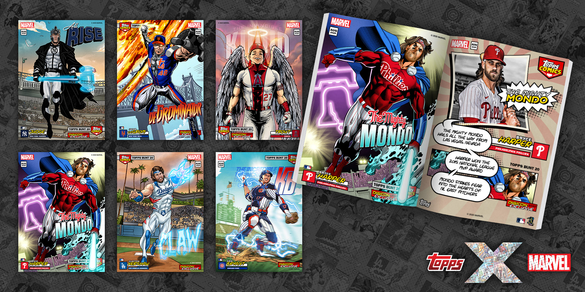 Crossover project of current MLB stars as Marvel superheroes. I'm proud to have art directed this project from start to finish, working with Marvel artists from sketches, to inks, and to full color art. From there, I took the amazing full color art and added all Topps and MLB branding, player/superhero nickname text, and all other graphic elements. See them brought to life with motion below and in the Topps MLB Bunt app!